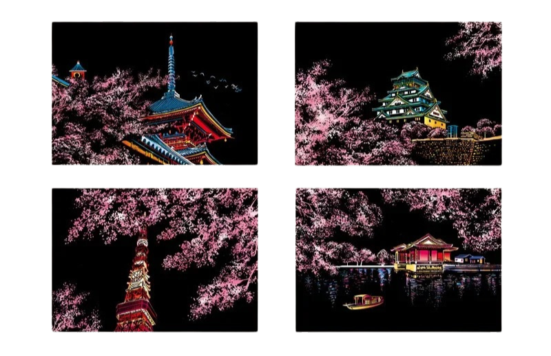 Cztery wyjątkowe obrazy w jednym zestawie! Każdy z nich kryje pod czarną powłoką złote wzory, które możesz odsłaniać krok po kroku. Idealny dla początkujących i osób szukających relaksu w kreatywny sposób. Doskonały sposób na spokojny wieczór i satysfakcję z własnoręcznie stworzonego dzieła sztuki.
